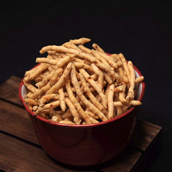 Karasev is a traditional Indian snack made with gram flour (besan), salt and spices. These are crunchy, have a lovely light texture and are aromatic. Karasev taste different from the traditional murukku and have an unique aroma of fried besan and carom seeds.